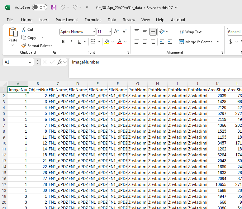 First column is an image number and second column is an object number, the rest are the different measurments.